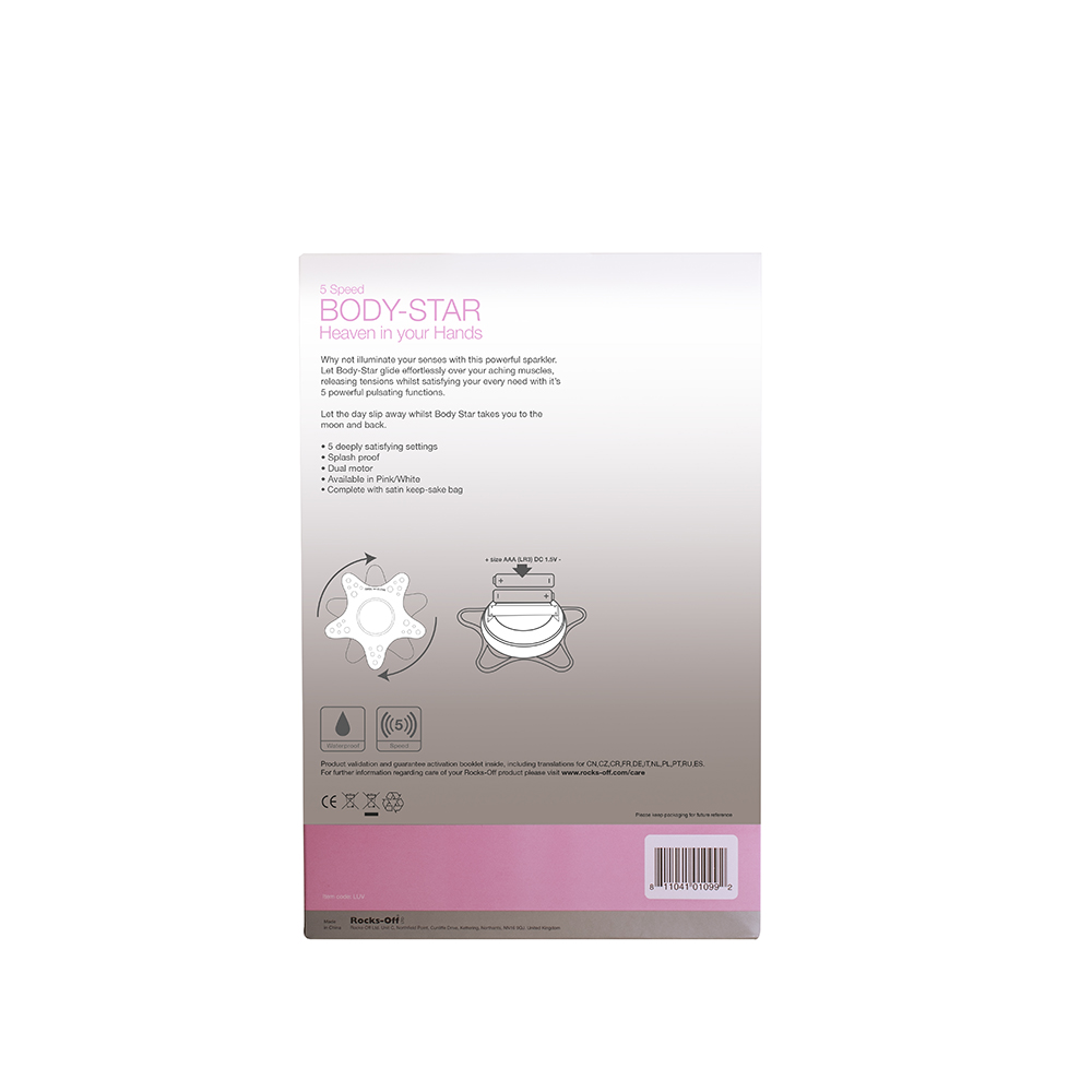 Rocks Off Body-Star имеет несколько настроек вибрации, которые можно легко настроить с помощью интуитивно понятных элементов управления. Предпочитаете ли вы мягкий массаж или что-то более интенсивное, этот массажер поможет вам.