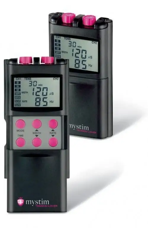 Электростимулятор MYSTIM TENSION LOVER. Имеет 4 самоклеющихся электрода, 7 различных программ - от нежного пощипывания до ритмичной пульсации. Есть большой и удобный дисплей для программирования режимов.