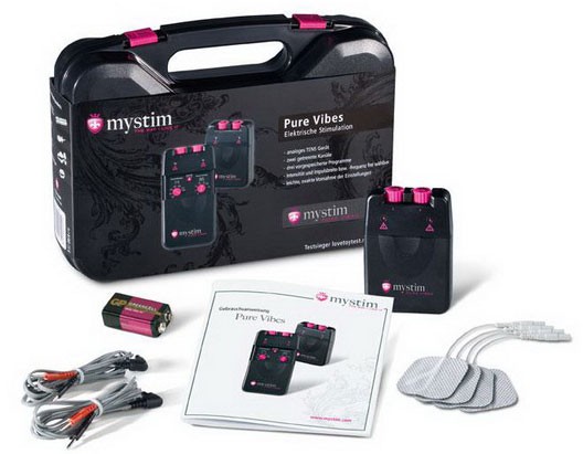 Электростимулятор MYSTIM PURE VIBES. Имеет четыре самоклеящихся электрода, два провода для самоклеющихся электродов, 1 батарейка, инструкция, оригинальный пластиковый кейс для хранения.