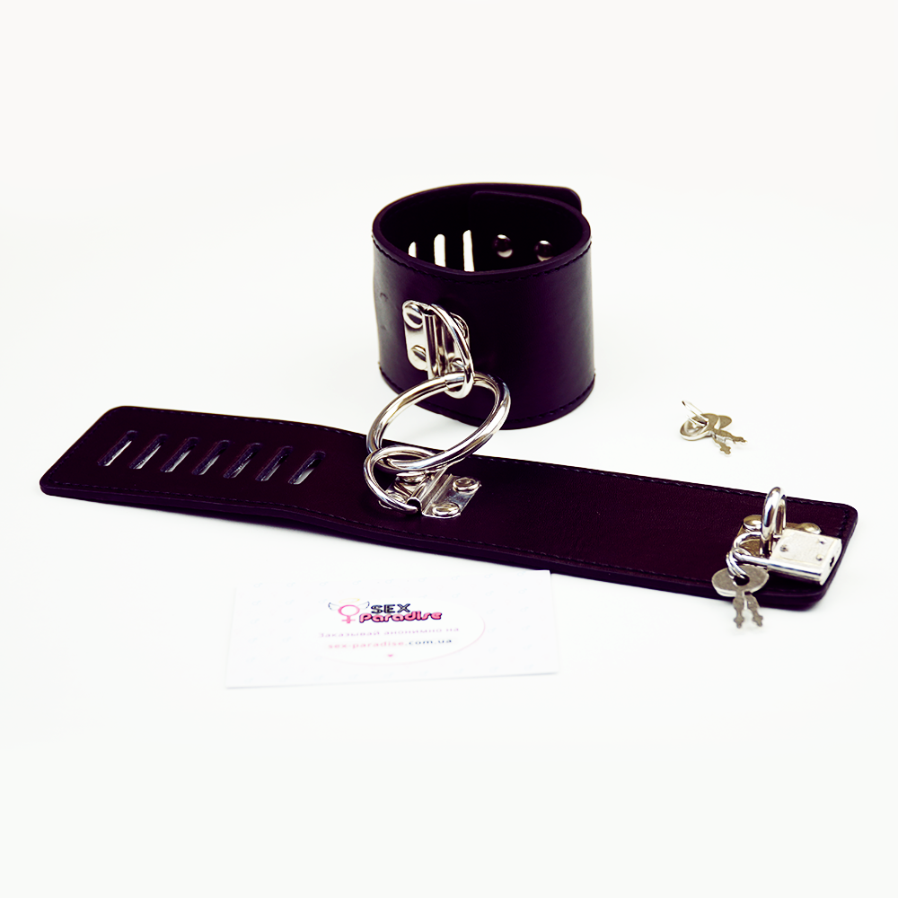 Изделие изготовлено из мягкой эко-кожи, которая не натирает запястье и не оставляет следов на теле. Размер регулируется. Общая длина наручников – 24,5 см. Фишкой этой модельки является замочек с ключиками. Наручники соединены между собой с помощью металлического кольца, благодаря чему вы сможете соединить наручники с другими аксессуарами для связывания из нашей коллекции.