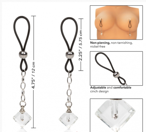 Ювелирные украшения для сосков California Exotic Novelties Crystal Gem — красивый и уникальный способ добавить блеска вашим интимным моментам. Это изысканное украшение для сосков изготовлено из высококачественных материалов и украшено потрясающим кристаллом, благодаря которому вы почувствуете себя королевой. Регулируемая цепочка обеспечивает идеальную посадку, а удобный дизайн обеспечивает максимальное удовольствие. Если вы ищете что-то особенное, чтобы оживить свои занятия в спальне, или просто хотите добавить немного гламура, это украшение для сосков обязательно добьется цели! Благодаря привлекательному дизайну и роскошному ощущению он обязательно станет одним из ваших любимых аксессуаров. Так почему бы не побаловать себя сегодня?